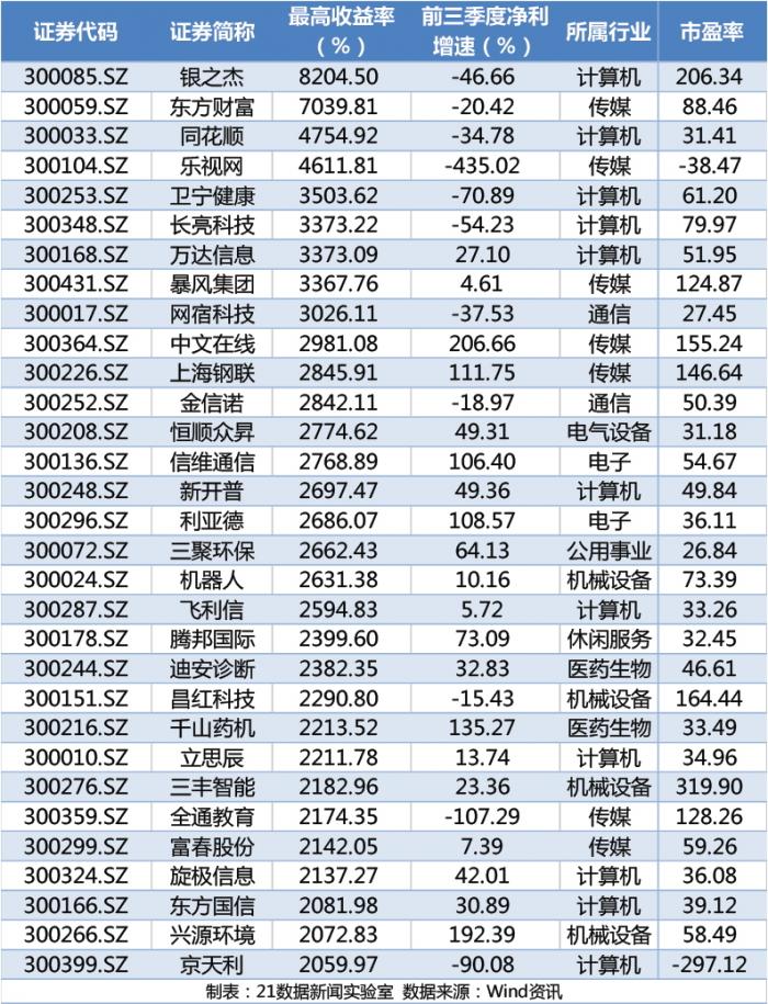最牛的当属银之杰,最高收益超过82倍,东方财富紧随其后,最高收益逾70倍。