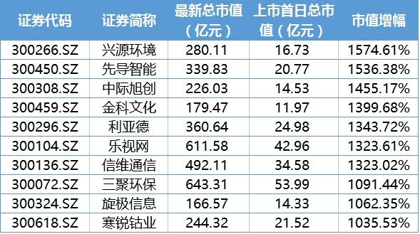 从市值来看,2009年10月30日上市的28只个股市值最高的乐普医疗,当日市值257.4亿元,而在八年后,创业板市值第一的温氏股份总市值已达1310亿元。据21数据新闻实验室统计,这八年间,有10家上市公司市值增幅超过10倍,兴源环境、先导智能等市值涨幅超过15倍。