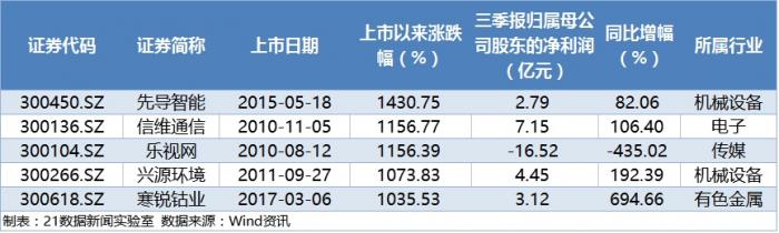 据21数据新闻实验室统计,自上市以来至10月30日,94%的创业板个股实现上涨,其中405股涨幅超100%,36股涨幅超5倍,先导智能、信维通信、乐视网、兴源环境、寒锐钴业等5股涨幅超10倍。