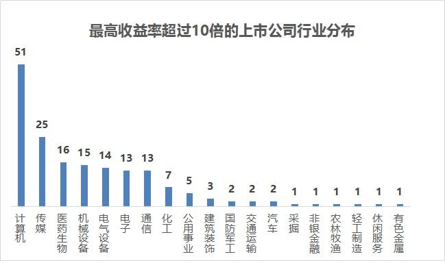 其实创业板的造富功能远远不止这样,按最理想的情况来看,以最低价买入最高价卖出,八年来有174股最大收益率超过10倍,多集中在计算机、传媒、医药生物、机械设备等板块。