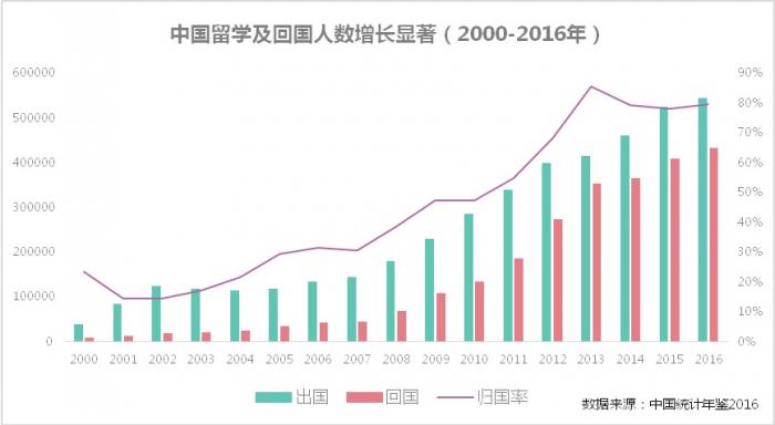 根据教育部数据,2016年中国出国留学人数达到54.5万人,中国已然成为世界最大的留学生输出国,同时出国留学完成学业后,选择回国发展的留学人员比例为82.23%。数据显示,截至到2016年年底,留学回国人员达到了265万人。
