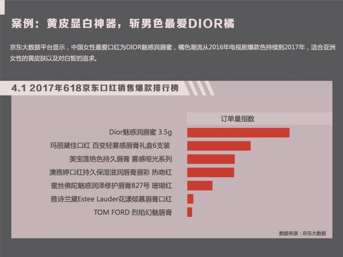 以爆款口红为例,京东大数据平台显示,中国女性最爱口红为DIOR魅惑润唇蜜,橘色潮流从2016年电视剧爆款色持续到2017年,适合亚洲女性的黄皮肤以及对白皙的追求。