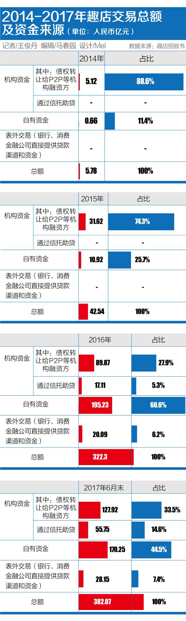 趣店的招股书显示,其2014年至2017年上半年的信贷交易总额分别为5.78亿元、42.54亿元、322.31亿元、382.06亿元。