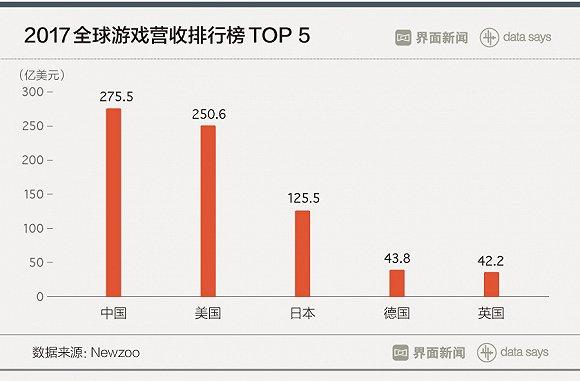 游戏市场情报研究机构Newzoo在今年5月发布的“2017全球游戏营收排行榜”显示,中国以275.5亿美元的总收入高居榜首,超越美国的250.6亿美元。