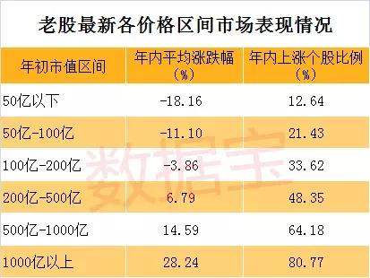 数据宝统计显示,年初A股市值千亿以上的股票,年内上涨平均值达到28.24%,上涨个股占比达到80.77%。500亿至千亿市值之间的股票,年内平均上涨幅度为14.59%,上涨个股比例达到64.18%。低市值股表现惨烈,年内平均下跌18.16%,仅有12.64%的股票股价上涨。