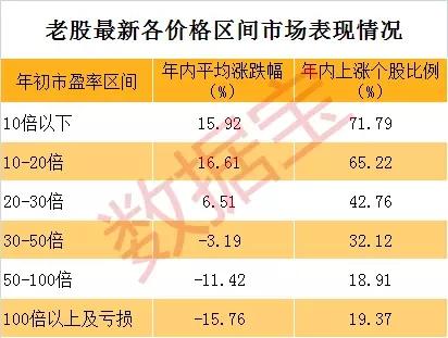 数据显示,年初市盈率10倍以下的股票,年内上涨平均值达到15.92%,上涨个股比例达到71.79%;10倍至20倍市盈率股票表现也不错,年内平均涨幅16.61%,上涨个股比例65.22%。百倍市盈率以上及亏损股表现惨烈,年内平均下跌15.76%,上涨个股比例仅有19.37%。50倍至100倍市盈率股票表现也很糟糕,年内平均下跌11.42%,上涨个股比例只有18.91%。
