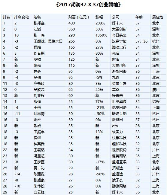 37位80后成功创业者上榜,比去年多15位,其中新上榜16位新人,下榜1位。总财富3006亿,平均财富81亿,比去年多5亿。