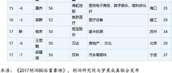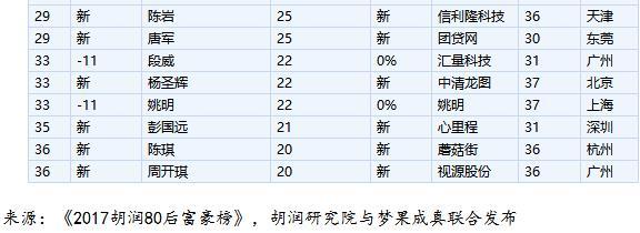 (2017年11月3日,北京)胡润研究院与全球互联网移动游戏创新者梦果成真今日联合发布胡润百富榜系列之一的《2017胡润80后富豪榜》(Hurun Young Entrepreneurs Rich ist 2017),这是胡润研究院连续第二次发布此榜单,内容包括《胡润37 X 37创业领袖》(37位80后白手起家富豪榜)和《胡润80后财富继承富豪榜》两个部分,财富计算的截止日期为2017年8月15日。