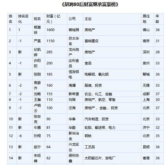 个人财富50亿及以上的接班人已有19位,以碧桂园杨惠妍为首,王思聪50亿排到第17,下降6位。