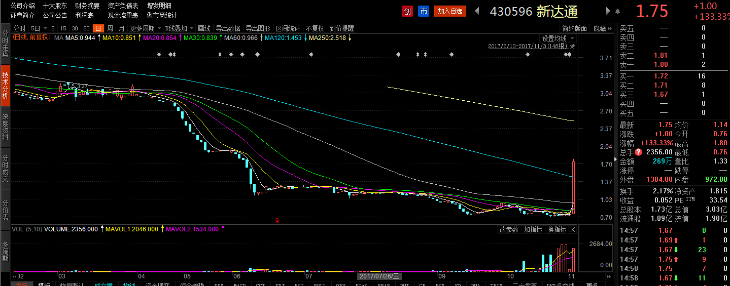 但从相关概念股的股价涨幅来讲,新三板公司新达通(430596)则让市场为之震惊,在11月3日新三板市场收盘后,新达通当日股价涨幅达到了惊人的133%。