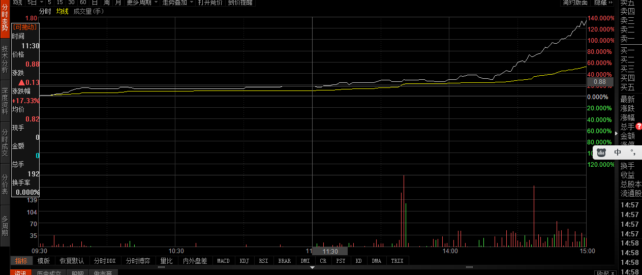 但午盘之后,信达通开启了暴涨模式,股价一路从0.88元每股涨至收盘时的1.75元每股,最终全天股价涨幅为133%,成交金额为269万元。