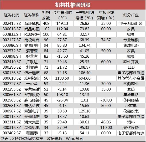 而从调研机构家数来看,有3家上市公司获得超过百家机构调研,其中海康威视最受关注,调研机构有408家;其次是尚品宅配和欧派家居,分别获得162家和100家机构调研。