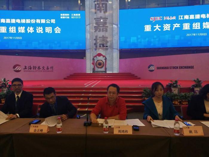 11月6日下午,江南嘉捷重大资产重组媒体说明会在上交所举行,奇虎360董事长周鸿祎一身标志性红色POLO衫在媒体前亮相。