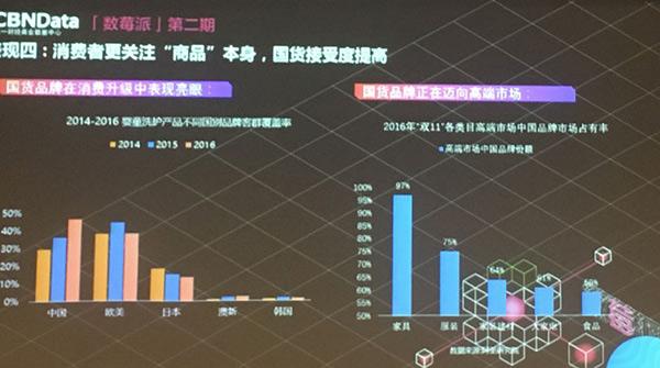 她以婴童洗护产品为例,说明国货的覆盖率在不断提升。“这跟我们原先想的不一样:母婴品类里面,大家觉得国际商品质量往往比较好,选择的可能性更大。其实并不是,如果国内商品能够获得消费者认可,大家也会愿意选择。另外,在‘双十一’节点,高端商品中,国货的占有率也越来越高。我们可以看一下这个排行,在家具、服装、家具建材、大家电领域,国货占到半数以上市场。”