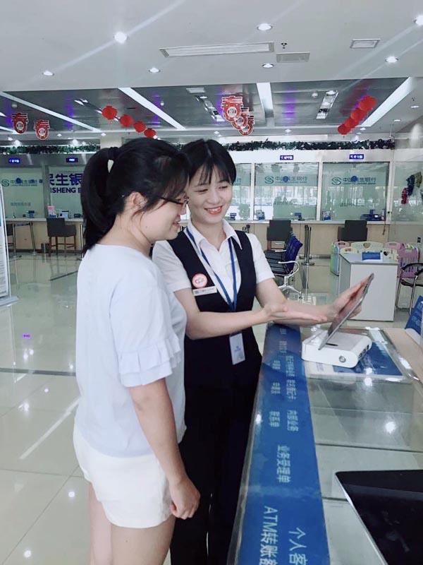 上午九点半,民生银行汕头潮南支行营业大厅里已经有很多客户,要么在柜台前办理业务,要么在使用自助机具,要么坐在等候区翻看宣传资料,只见一位笑容灿烂、仪态端庄的女孩在不停地穿梭奔忙,偌大的厅堂里秩序井然。这位女孩叫叶家瑶,是潮南支行的服务经理。