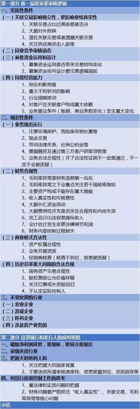 新一届发审委在2017年11月7日这一天大开杀戒,市场震动,其审核逻辑究竟如何,这里做一个简单的探索和回顾。按照首发办法设计的基本框架,其实一直以来就是区分为“实质性条件”和“规范性条件”,前者包括关联交易影响利润真实性、同业竞争、募集资金运用,并在此基础上形成的“持续盈利能力判断“,后者包括规范运行条件、财务规范性、财务与非财务信息的匹配、商业模式合法性。