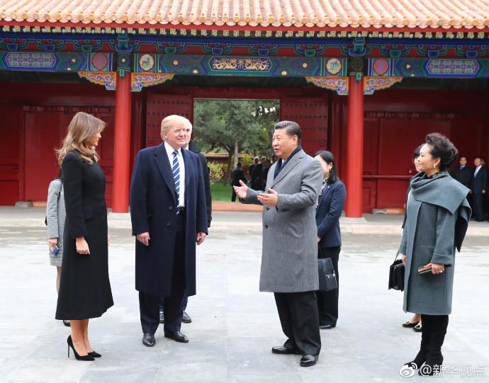 据新华社报道,国家主席习近平和夫人彭丽媛8日下午在故宫博物院迎接来华进行国事访问的美国总统特朗普和夫人梅拉尼娅。两国元首夫妇在宝蕴楼简短茶叙。
