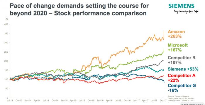 与大部分公司不同,西门子2017财年指2016年10月1日至2017年9月30日。这期间,西门子市值增长了14.4%至1192亿欧元。实体业务(Industrial Business)利润额同比增长8%,达95亿欧元。楼宇科技集团、数字化工厂集团、交通集团和过程工业与驱动集团均实现两位数的增长,抵消了发电与天然气集团以及西门子歌美飒业绩下降所带来的不利影响,并实现盈余。