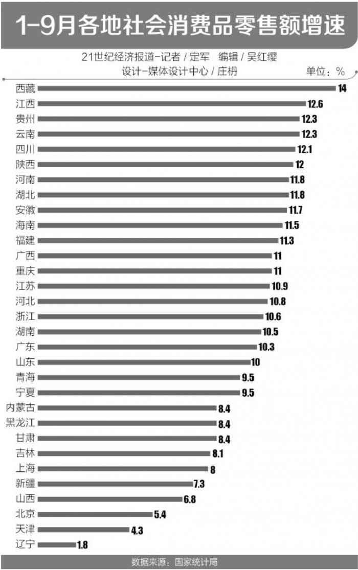 21世纪经济报道记者梳理国家统计局公布的数字发现,前三季度,全国有19个省市社会消费品零售总额增速实现了两位数增长,占比超过60%。