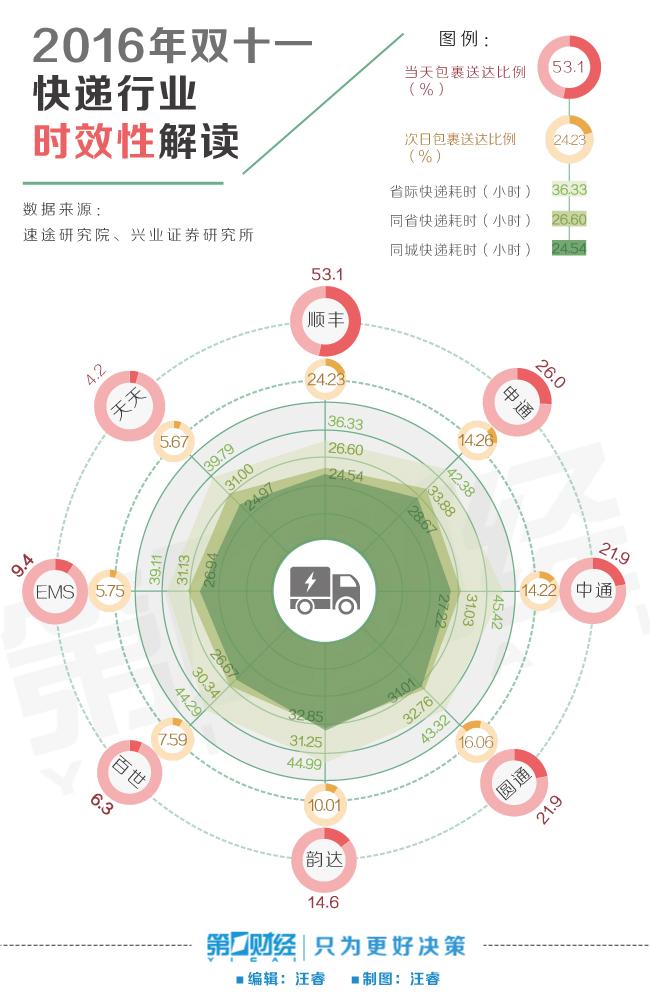 总体来说,从2016年双十一数据看来,顺丰毫无疑问是第一梯队,而龙头企业“三通一达”也都表现不错。
