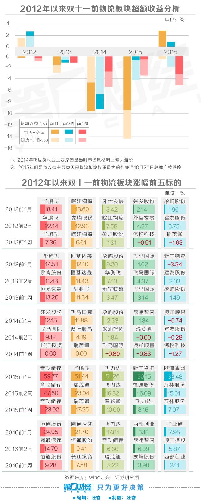 在分析了2012年以来双十一期间的物流板块行情之后,兴业证券分析师指出,快递企业上市之前,双十一期间表现较好的物流股多为小市值标的,典型的有华鹏飞、飞力达、音飞储存。而快递企业上市后的2016年,由于有了直接标的,当年的龙头圆通则作为领涨标的出现大幅超额收益。