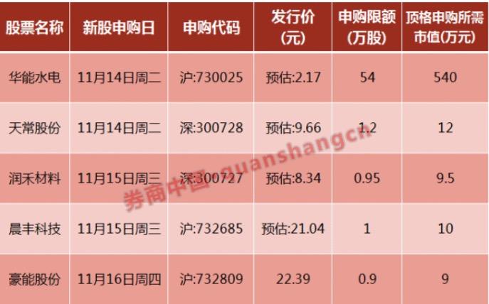 具体来看,本周共计5只新股申购,周二2只:华能水电、天常股份;周三2只:润禾材料、晨丰科技;周四1只:豪能股份。