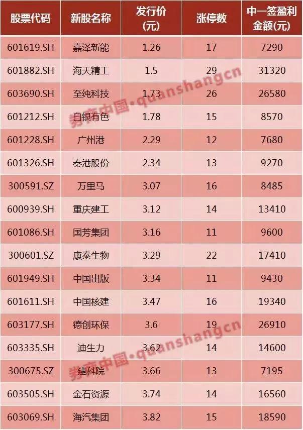 2016年以来,发行价格低于4元的新股共计17只,平均涨停数为16个。以此计算,中一签华能水电可赚1.1万元,若中两签或三签,其收益情况不菲。