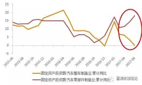 一辆新能源汽车的整车制造成本只占28%,而零部件成本占到72%;相比之下,一辆燃油汽车的零件成本只占50%左右。新能源车的技术核心是“三电”(电驱动、电池、电控)等零件而非整车。当2017年新能源汽车销售走高后,汽车零部件和整车制造的固定资产投资出现背离。汽车零配件固定资产投资迅速增长,从3月的10.9%上升至6月的18.3%,而整车固定资产投资降至0。