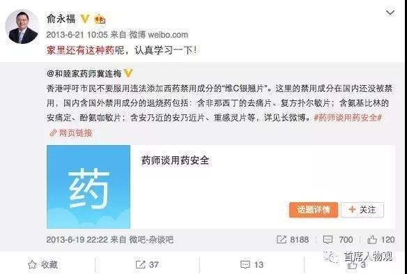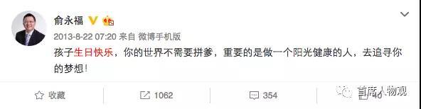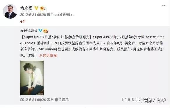 甚至,在2012年6月,他还转发了一条新浪娱乐关于Super Junior的娱乐新闻,评论区里,网友炸窝般讨论,究竟是俞永福本人喜欢,还是孩子手滑盗用了老爹的微博账号。