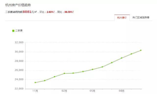 杭州这几年来发展成绩显著,在今年10月房价也已经突破3万/平米。据房天下,杭州二手房10月均价30351元平米,同比上涨36.89%,近一年来杭州房价一直呈上涨趋势,从去年年底的每平米2.3万上涨到3万。