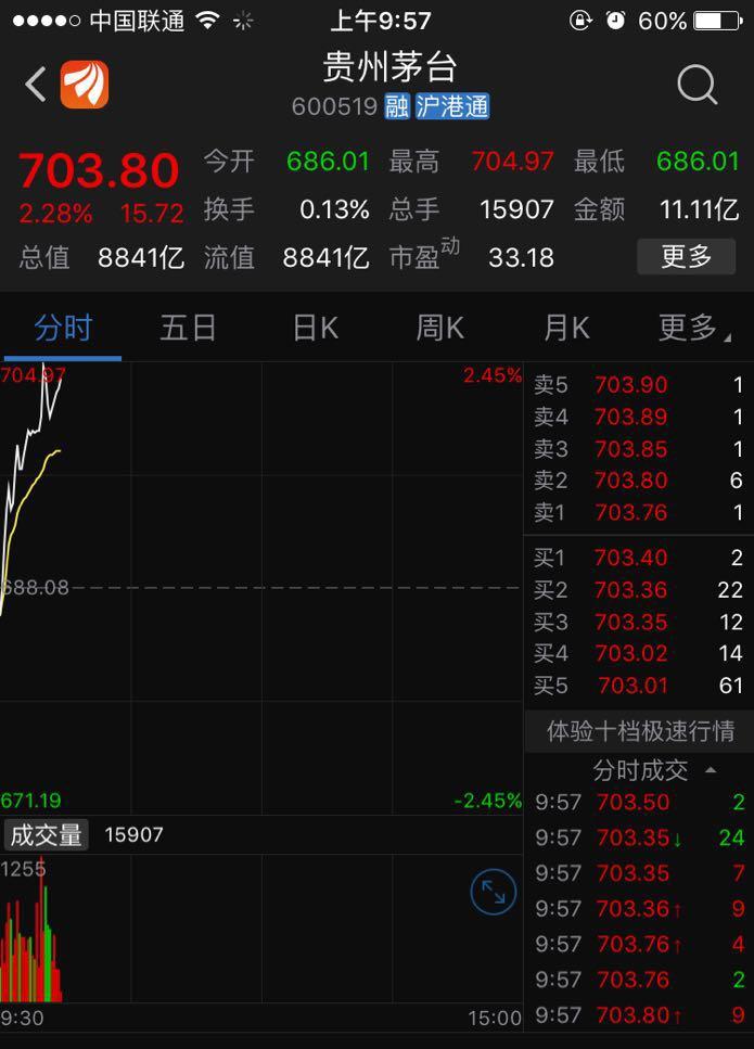 11月16日,贵州茅台早盘低开高走,股价突破700元/股,市值超过8800亿元。
