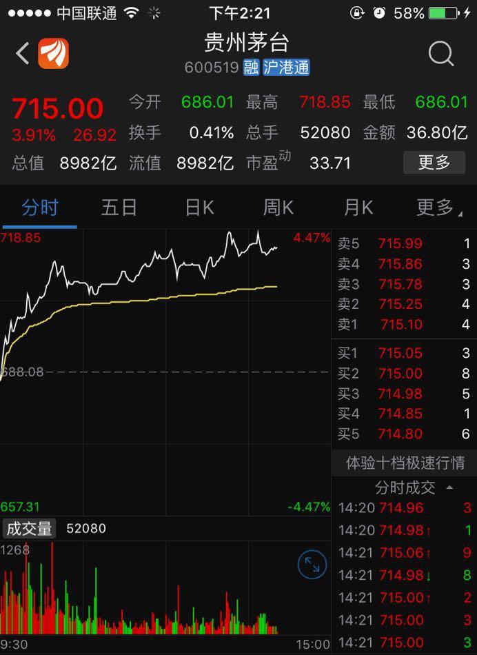 最新消息:继早盘突破700元之后,下午开盘,茅台股价一度站上718元,总市值突破9000亿元,稍后回落,仍逼近9000亿元。(14:21)