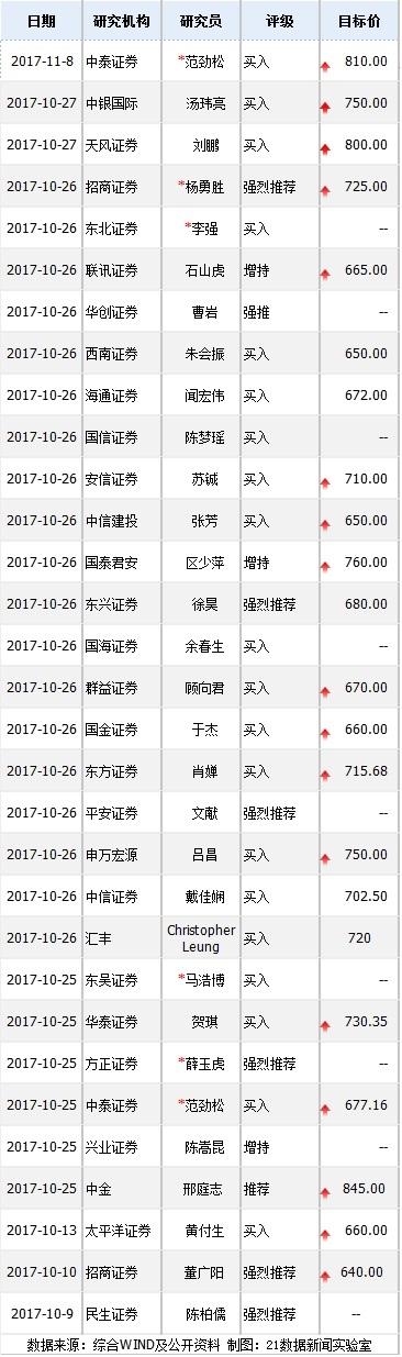 据21数据新闻实验室不完全统计,有30家券商机构针对茅台三季报进行点评,纷纷给出“买入”“增持”评级。而这些研报无不例外都提及了茅台17年收入业绩持续超预期!其中17家上调了目标价,最高达845元!