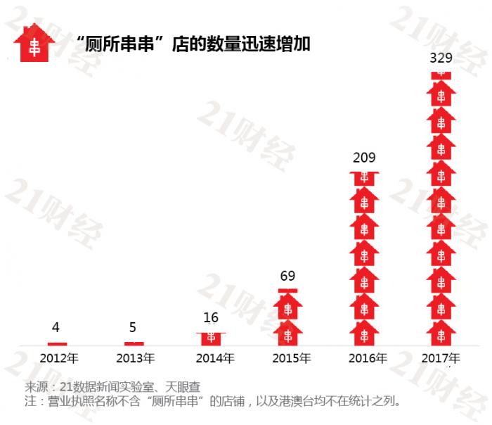 目前,这种美味又有噱头的“厕所串串”遍地开花。据天眼查数据统计,全国仅工商登记在册的“厕所串串”店,已经从5年前的4家,扩张到如今的329家(数据统计截止2017年11月18日)。