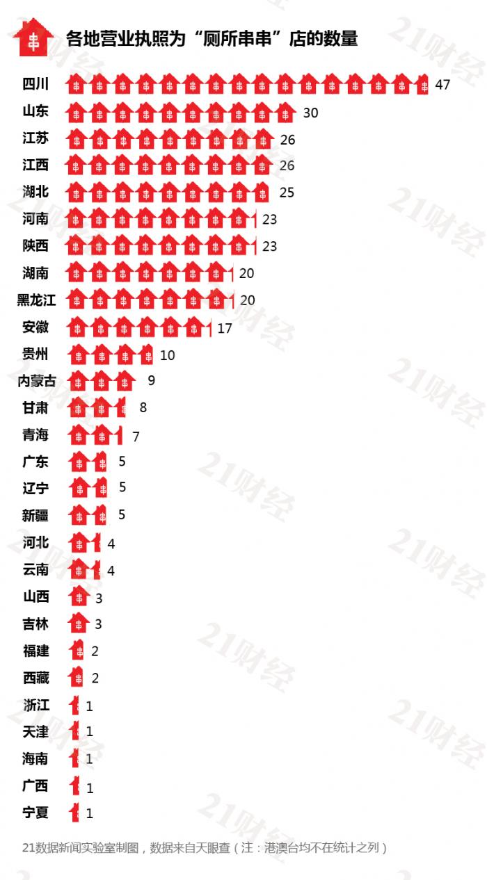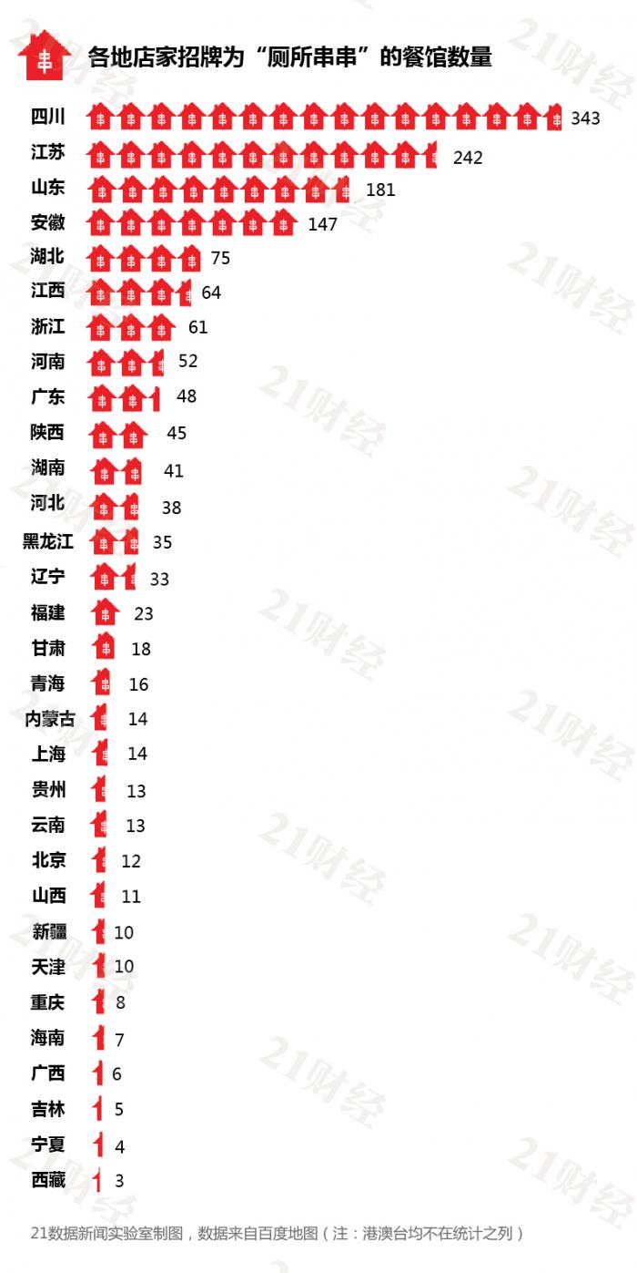 从区域分布来看,作为发源地的四川省高居榜首,其次是山东、江苏、江西、湖北、河南、陕西、湖南、黑龙江等地。以上各地至少有20家“厕所串串”店。