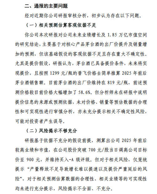 上交所认为,安信证券给出“茅台2025年1.85万亿市值”以及“依据1299元/瓶的普飞价格去简单推算2025年前后茅台酒销售额大幅增加”的说法依据不足,相比“目前茅台酒出厂价819元/瓶,前述预测价格较目前价格大幅增加了58.6%”。但是,该分析师“未对提价信息的来源或预测依据,未对价格、销量等预估数据的合理性和可实现性审慎分析”,同时对风险提示也不够充分。