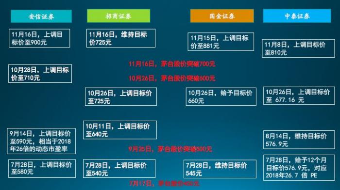 不够理性的绝非安信证券一家。21世纪经济报道记者发现,从今年半年报以来,多家券商集体“醉心”茅台,纷纷上调其目标价,背后到底是什么样的考虑?