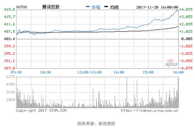 受游戏业务影响,腾讯港股股价开启“狂飙模式”,上周五(11月17日)股价盘中突破400港元,创历史新高,收于403.4港元。昨日(11月20日)强势上涨持续,高开于405.4港元,收于420港元,日内大涨4.115%,腾讯港股市值达到39895.48亿港元,逼近4万亿港元大关。今早开盘即涨1.19%,市值突破4万亿港元,随后股价持续拉升,股价报439港元,市值一度飙升至41681亿港元。
