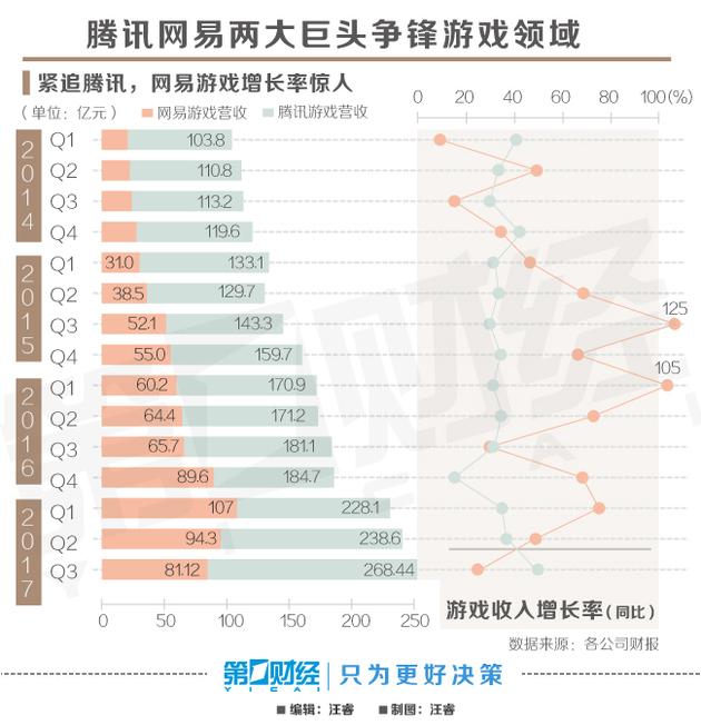 日前,腾讯和网易相继发布了2017年第三季度财报。财报显示,腾讯第三季度总收入652.1亿元,同比增长61%;网易营收124.78亿元,同比增长35.5%。