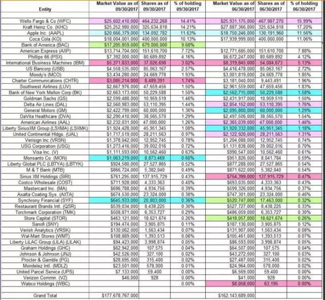 下图是巴菲特的伯克希尔哈撒韦公司在2017年第三季度控股的详细数据: