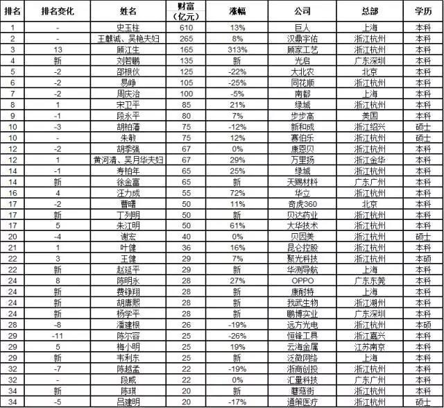 顾家工艺的顾江生财富涨到去年4倍多,以165亿进入浙大最能创造财富的校友前三名。光启的刘若鹏新上榜进入前五。
