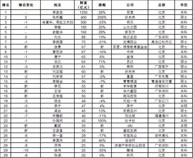 好未来的张邦鑫财富涨到去年3倍多,以400亿进入北大最能创造财富的校友前三名。肖建华虽然财富缩水了33%,但仍位列北大校友前三。北大最能创造财富的校友前15名中有2位新人,百度的徐勇进入前十;好未来的刘亚超进入前15。