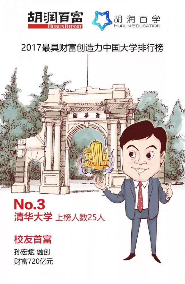 胡润研究院今日联合国际教育平台胡润百学发布《2017胡润百学•最具财富创造力中国大学排行榜》(Hurun Education Most Successful University Alumni 2017),共有78所国内高校都至少有2位校友登上今年胡润百富榜。