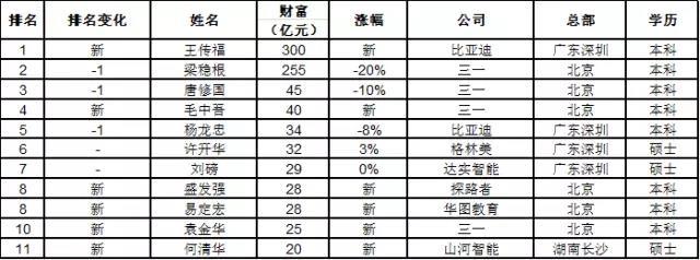 王传福成为中南大学新首富。中南大学最能创造财富的校友前10名中有4位新人:三一的毛中吾和袁金华、探路者的盛发强和华图教育的易定宏。