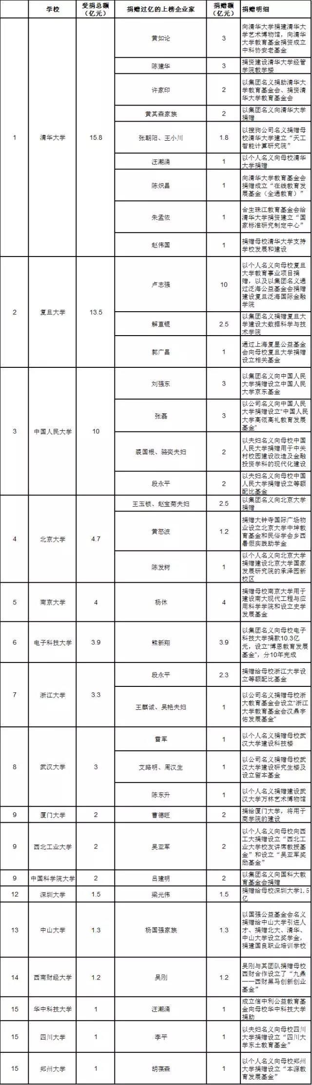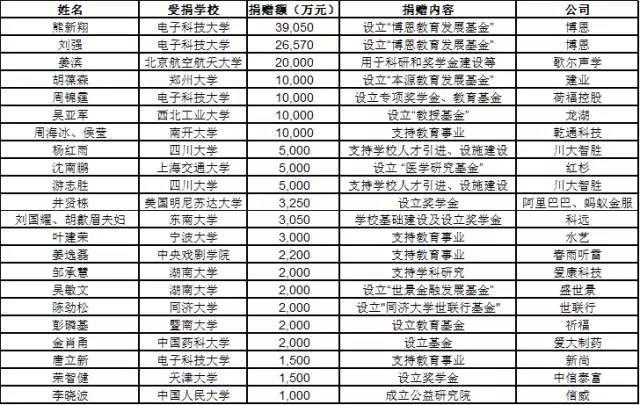 2017胡润慈善榜显示,过去一年企业家教育方面捐赠最多的仍然为母校捐赠,有22位上榜。过去一年受捐过亿的大学有:电子科技大学超过11亿;北京航空航天大学2亿;南开大学、西北工业大学、郑州大学和四川大学各1亿。