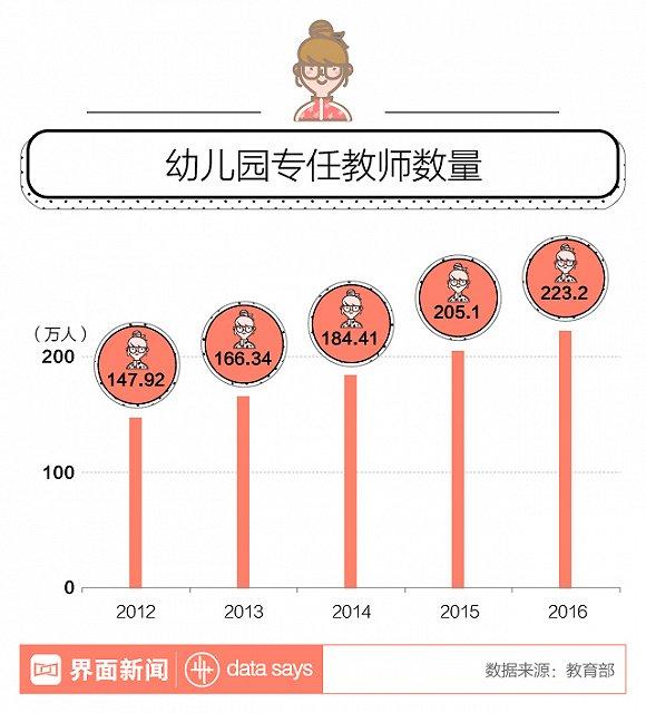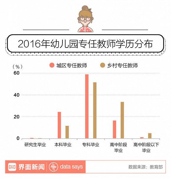 事实上,虽然中国幼师数量在近年不断增长,但整体学历并不高。教育部数据显示,2016年,在全国223.2万名幼师中,拥有本科及以上学历的只有约20%,大多数幼师都是专科毕业。并且,约四成乡村地区幼师仅有高中及以下学历,幼师的综合素质显著低于城区。