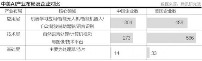 从创业投资领域角度来看,美国面向全产业投资,投资领域遍及基础层、技术层和应用层,而中国接受融资的企业主要集中在应用层;美国AI产业布局全面领先,在基础层、技术层和应用层,尤其是在算法、芯片和数据等产业核心领域,积累了强大的技术创新优势,各层级企业数量全面领先中国。