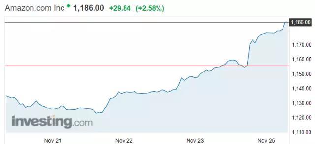 今日(11月25日),亚马逊一路刷新纪录高位,收报1186美元,上涨2.58%,连续三个交易日(11月23日因感恩节而休市)创收盘纪录新高,本周(四个交易日)涨幅扩大至4.97%,2017年迄今涨58.18%。