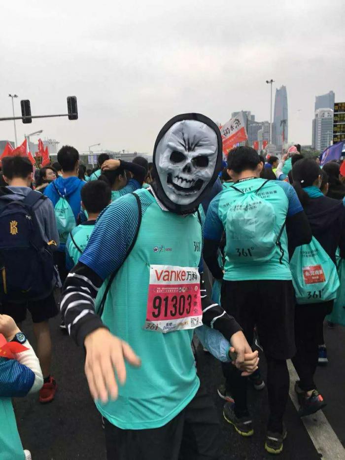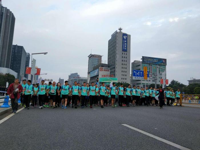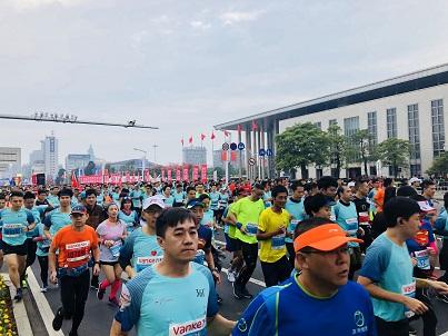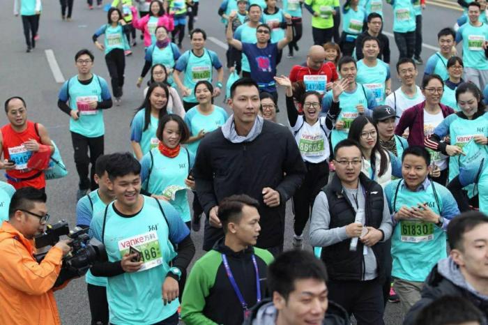 上午六点半,天微亮,中心广场已人头攒动,大量跑者在现场进行热身运动。惊喜的是,6点50分左右,中国知名篮球运动员易建联惊现马拉松赛场,与场内跑者进行互动。