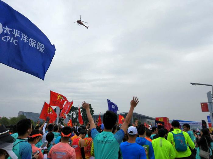 正式开跑前,跑者们手拉手一排排走过赛道,而在航拍器略过头顶的那一刹那,无数跑者开始欢呼,并向头顶的航拍飞行器招手。